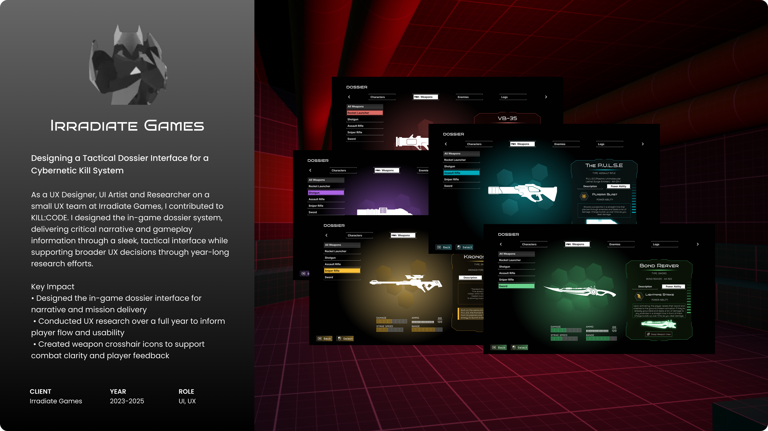 I love collaborating with teams of all sizes, from small, tight-knit groups of under 15 to large international teams of 40 or more, often working across multiple time zones and creative disciplines. My design experience spans a wide range of UI styles, from sleek 2D interfaces to immersive 3D environments, including both diegetic and non-diegetic systems.